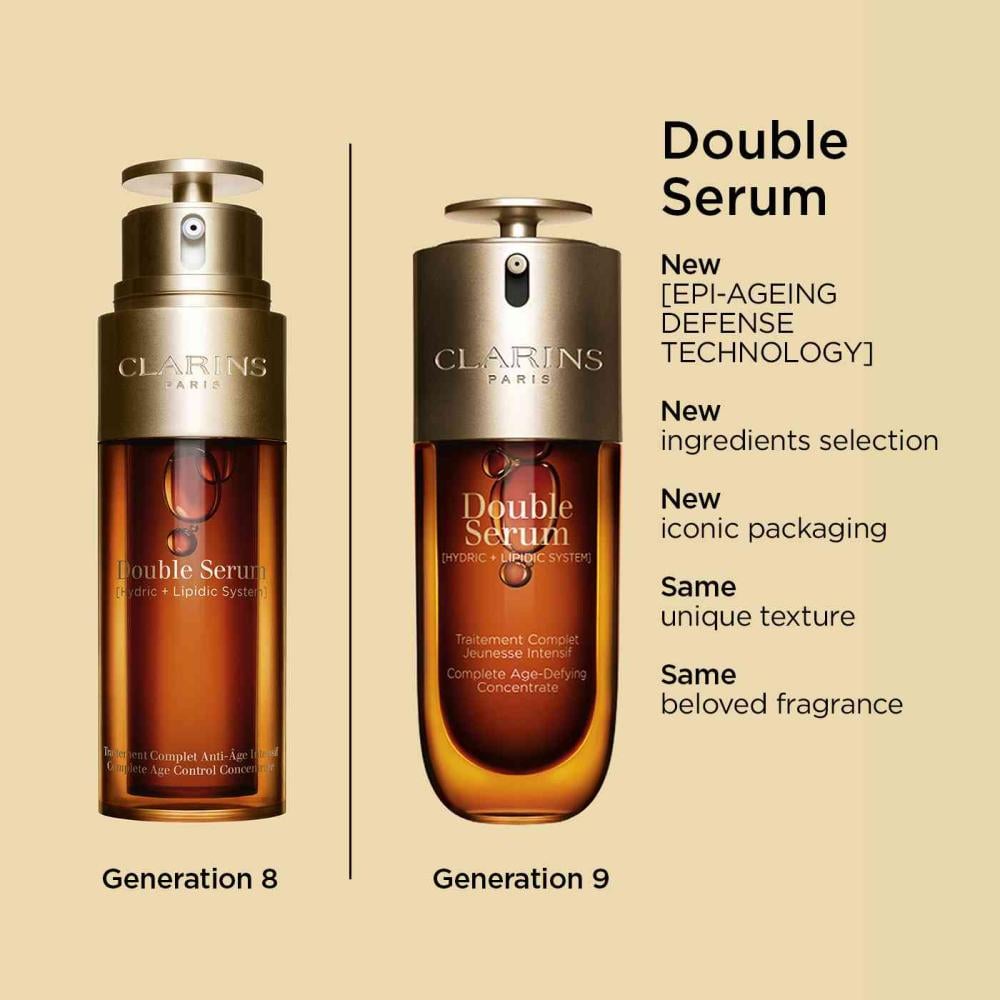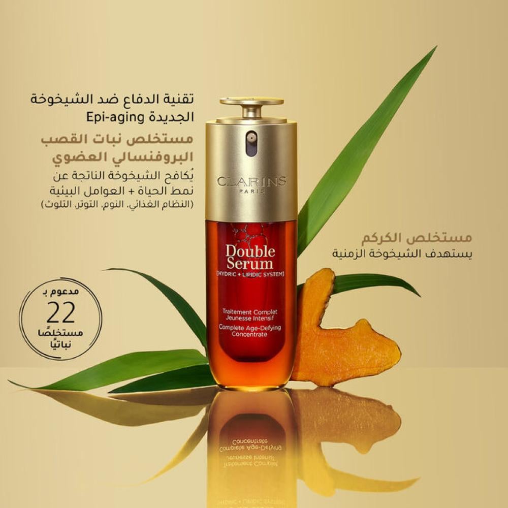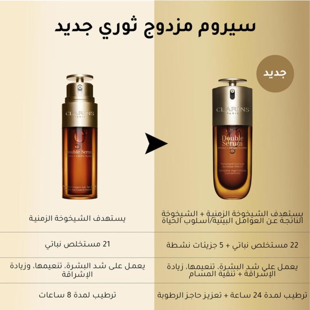 يتخطى مصل Double Serum حدود الابتكار في مجال مكافحة الشيخوخة ويعيد اختراع نفسه في جيل جديد بقوة متزايدة*.تركيبته المزدوجة الفريدة، التي تتكون من 95% من المكونات ذات المصدر الطبيعي، تجمع بين 22 مستخلصًا نباتيًا قويًا، بما في ذلك مستخلص الكركم الشهير، مع 5 جزيئات نشطة نقية جديدة لتحفيز الوظائف الحيوية الخمس للبشرة.مستوحاة من علم علم الوراثة، تستهدف تقنية Epi-ageing Defence الفريدة علامات الشيخوخة المرتبطة بالشيخوخة الناجمة عن نمط الحياة. بفضل مستخلص القصب الطويل من بروفانس، يساعد على تقوية مقاومة الجلد لبيئته للحد من ظهور الشيخوخة.تحتوي عبوته الجديدة على 94%** من المواد القابلة لإعادة التدوير وتتميز بنظام [Hydric + Lipidic]، الذي يحافظ على الصفات الجوهرية لهاتين المرحلتين.*مقارنة بالجيل الثامن من مصل Double Serum**حجم القاعدة 50 مل